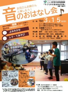 児童館コスモスで、令和8年(2026年)3月15日に「お兄さんお姉さんと楽しもう!音のおはなし会」を行います。